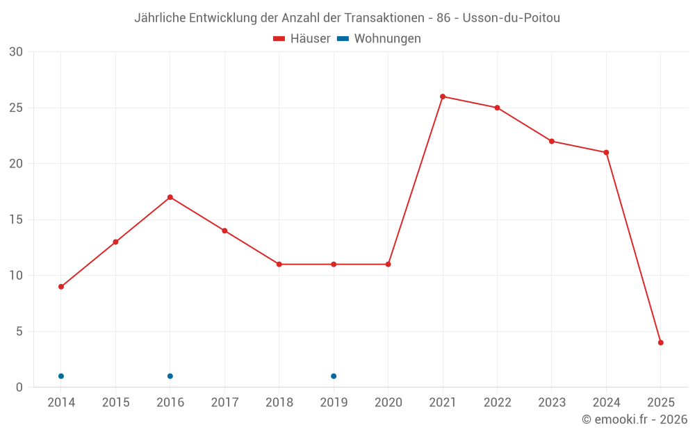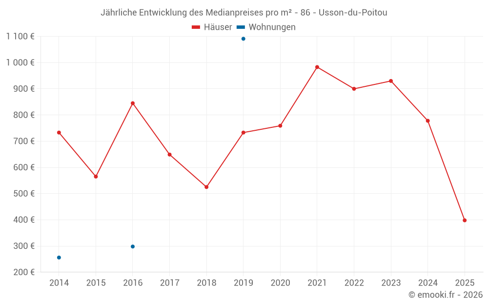 Der Durchschnittspreis auf den 38 Hausgeschäften der letzten 24 Monate in der Gemeinde Usson-du-Poitou betrug 833 € pro Quadratmeter für einen mittleren Immobilienwert von 68 000 €. Über diesen Zeitraum hinweg lagen 60% der Transaktionen zwischen 470 und 1 068 € pro Quadratmeter (vom 2. bis zum 8. Dezil).