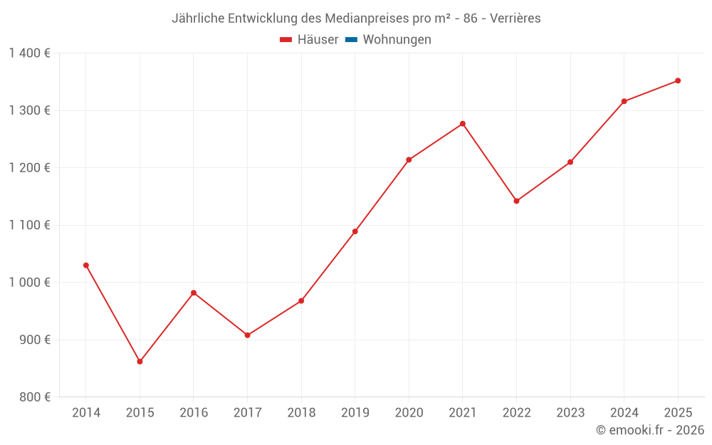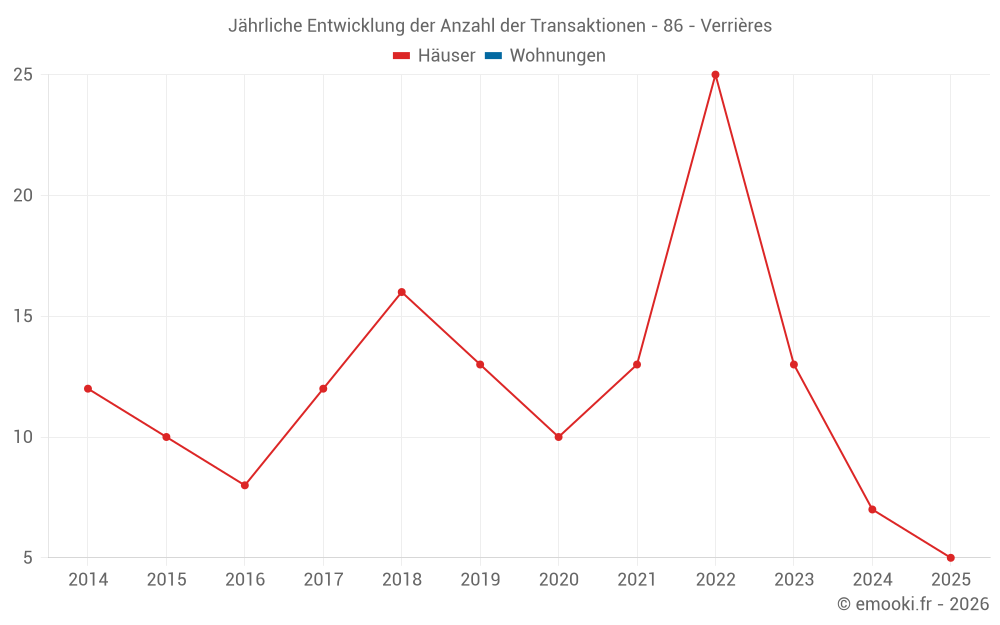 Der Durchschnittspreis auf den 17 Hausgeschäften der letzten 24 Monate in der Gemeinde Verrières betrug 1 316 € pro Quadratmeter für einen mittleren Immobilienwert von 130 000 €. Über diesen Zeitraum hinweg lagen 60% der Transaktionen zwischen 827 und 1 643 € pro Quadratmeter (vom 2. bis zum 8. Dezil).