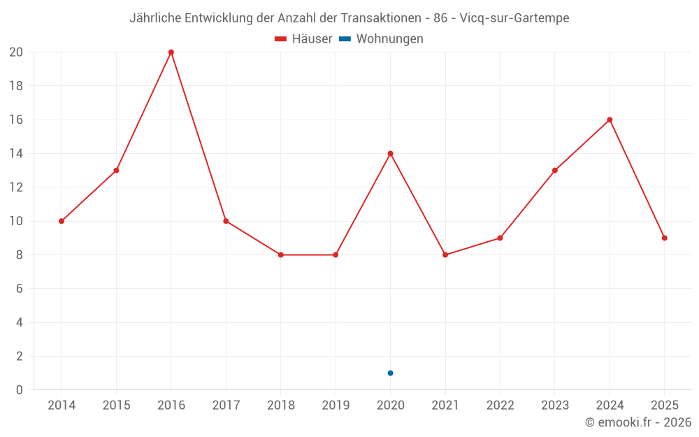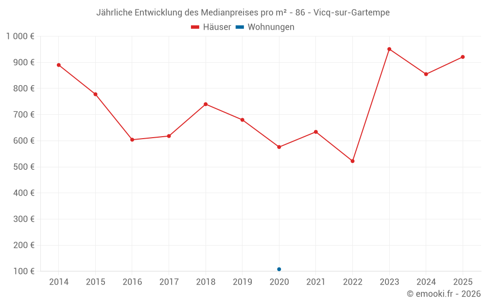 Der Durchschnittspreis auf den 21 Hausgeschäften der letzten 12 Monate in der Gemeinde Vicq-sur-Gartempe betrug 919 € pro Quadratmeter für einen mittleren Immobilienwert von 75 000 €. Über diesen Zeitraum hinweg lagen 60% der Transaktionen zwischen 686 und 1 250 € pro Quadratmeter (vom 2. bis zum 8. Dezil).