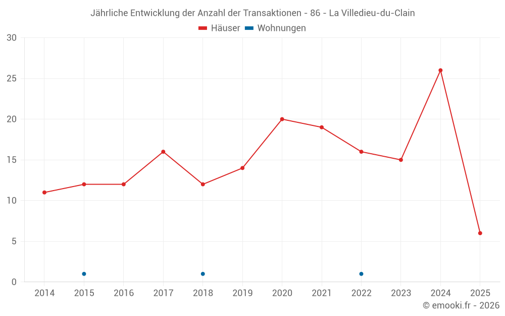 Der Durchschnittspreis auf den 20 Hausgeschäften der letzten 12 Monate in der Gemeinde La Villedieu-du-Clain betrug 1 624 € pro Quadratmeter für einen mittleren Immobilienwert von 159 500 €. Über diesen Zeitraum hinweg lagen 60% der Transaktionen zwischen 1 277 und 1 872 € pro Quadratmeter (vom 2. bis zum 8. Dezil).