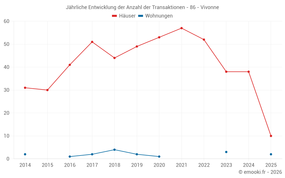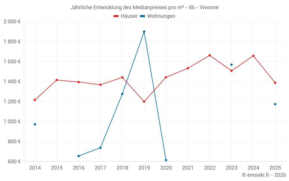 Der Durchschnittspreis auf den 34 Hausgeschäften der letzten 12 Monate in der Gemeinde Vivonne betrug 1 622 € pro Quadratmeter für einen mittleren Immobilienwert von 139 000 €. Über diesen Zeitraum hinweg lagen 60% der Transaktionen zwischen 1 199 und 1 993 € pro Quadratmeter (vom 2. bis zum 8. Dezil).