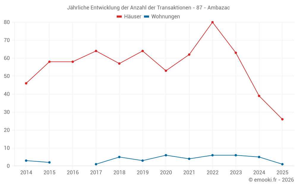 Der Durchschnittspreis auf den 26 Hausgeschäften der letzten 6 Monate in der Gemeinde Ambazac betrug 1 496 € pro Quadratmeter für einen mittleren Immobilienwert von 140 250 €. Über diesen Zeitraum hinweg lagen 60% der Transaktionen zwischen 846 und 2 041 € pro Quadratmeter (vom 2. bis zum 8. Dezil).