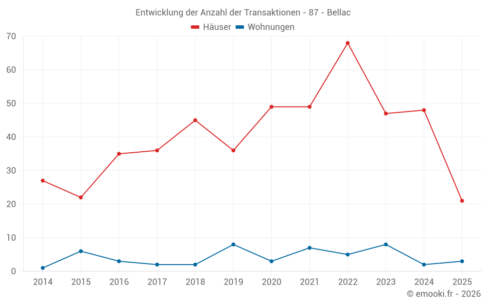 Der Durchschnittspreis auf den 21 Hausgeschäften der letzten 6 Monate in der Gemeinde Bellac betrug 886 € pro Quadratmeter für einen mittleren Immobilienwert von 80 000 €. Über diesen Zeitraum hinweg lagen 60% der Transaktionen zwischen 553 und 1 450 € pro Quadratmeter (vom 2. bis zum 8. Dezil).