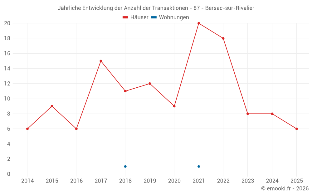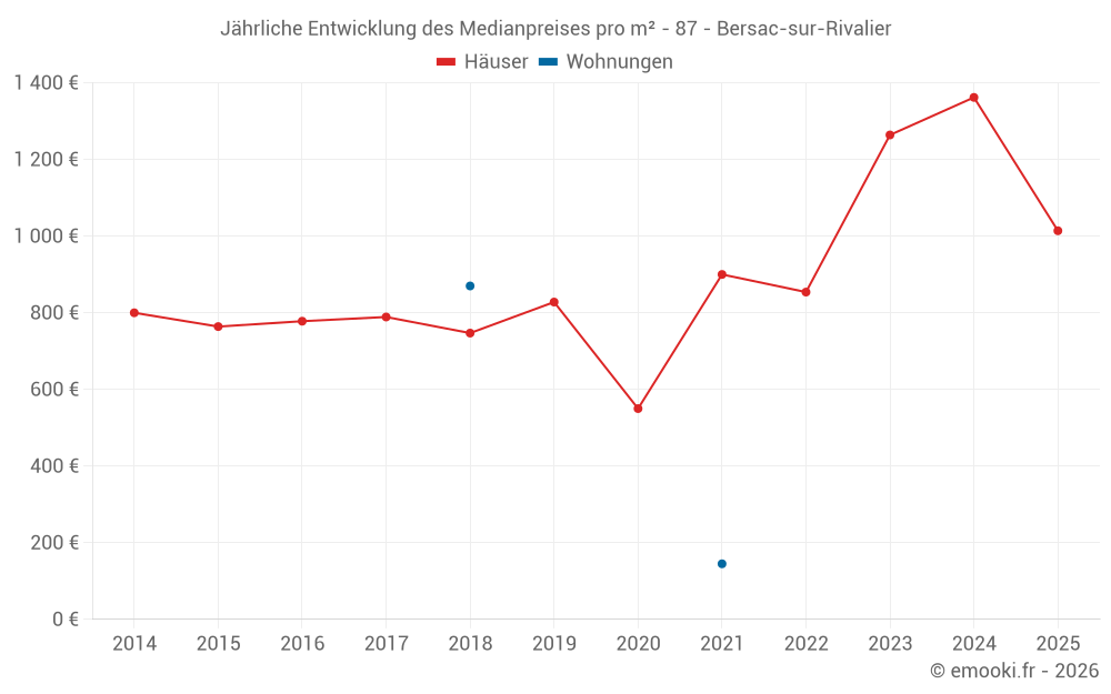 Der Durchschnittspreis auf den 17 Hausgeschäften der letzten 24 Monate in der Gemeinde Bersac-sur-Rivalier betrug 1 124 € pro Quadratmeter für einen mittleren Immobilienwert von 94 620 €. Über diesen Zeitraum hinweg lagen 60% der Transaktionen zwischen 743 und 1 808 € pro Quadratmeter (vom 2. bis zum 8. Dezil).
