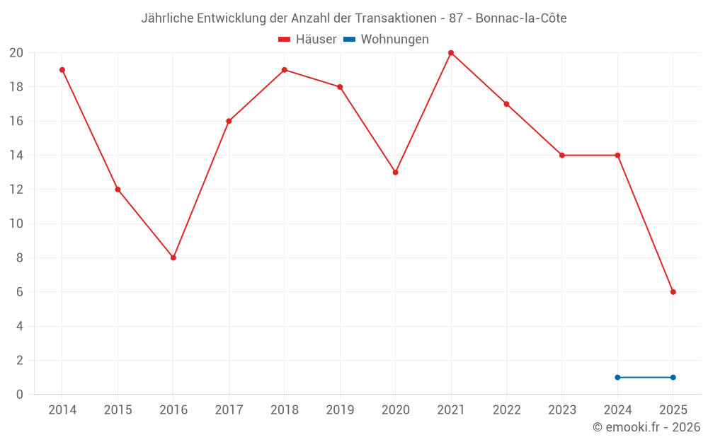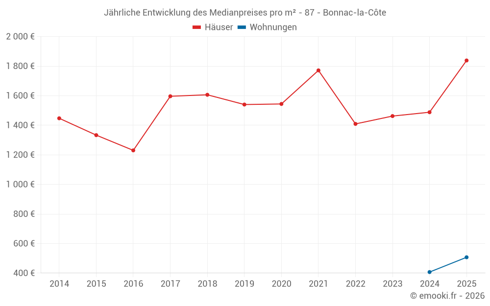 Der Durchschnittspreis auf den 16 Hausgeschäften der letzten 12 Monate in der Gemeinde Bonnac-la-Côte betrug 1 497 € pro Quadratmeter für einen mittleren Immobilienwert von 131 000 €. Über diesen Zeitraum hinweg lagen 60% der Transaktionen zwischen 859 und 1 882 € pro Quadratmeter (vom 2. bis zum 8. Dezil).