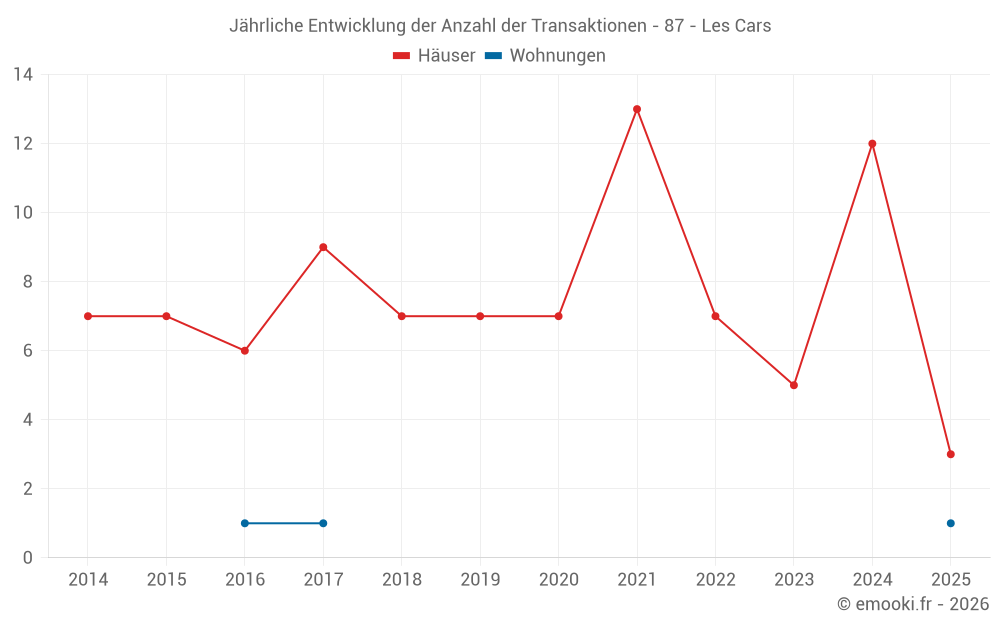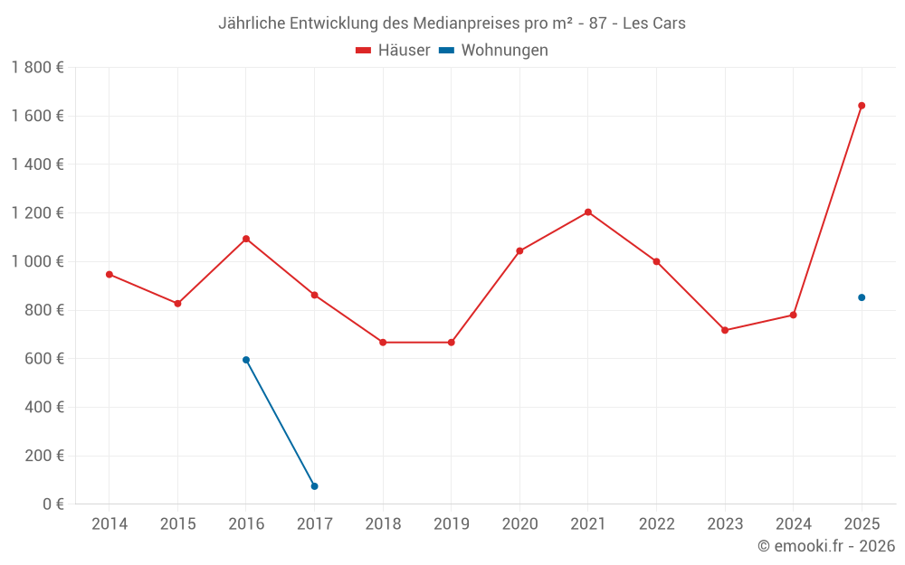 Der Durchschnittspreis auf den 16 Hausgeschäften der letzten 24 Monate in der Gemeinde Les Cars betrug 790 € pro Quadratmeter für einen mittleren Immobilienwert von 95 150 €. Über diesen Zeitraum hinweg lagen 60% der Transaktionen zwischen 581 und 1 471 € pro Quadratmeter (vom 2. bis zum 8. Dezil).