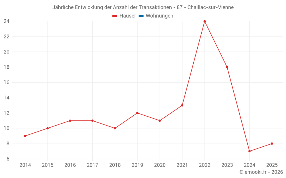 Der Durchschnittspreis auf den 15 Hausgeschäften der letzten 24 Monate in der Gemeinde Chaillac-sur-Vienne betrug 1 948 € pro Quadratmeter für einen mittleren Immobilienwert von 175 000 €. Über diesen Zeitraum hinweg lagen 60% der Transaktionen zwischen 1 057 und 2 210 € pro Quadratmeter (vom 2. bis zum 8. Dezil).