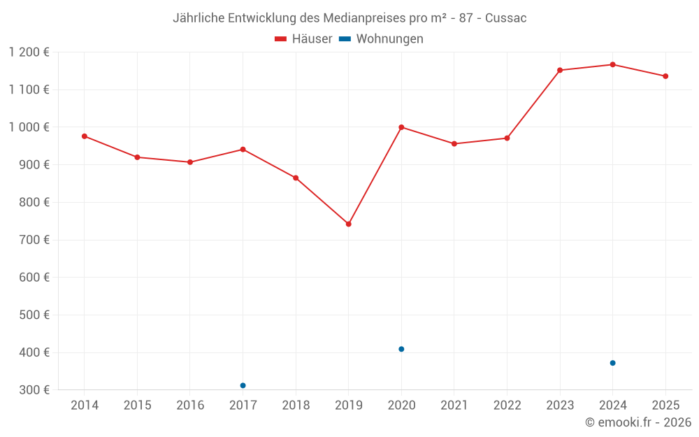 Der Durchschnittspreis auf den 16 Hausgeschäften der letzten 12 Monate in der Gemeinde Cussac betrug 1 068 € pro Quadratmeter für einen mittleren Immobilienwert von 75 975 €. Über diesen Zeitraum hinweg lagen 60% der Transaktionen zwischen 687 und 1 918 € pro Quadratmeter (vom 2. bis zum 8. Dezil).