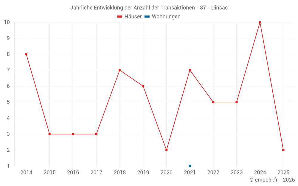 Der Durchschnittspreis auf den 14 Hausgeschäften der letzten 24 Monate in der Gemeinde Dinsac betrug 673 € pro Quadratmeter für einen mittleren Immobilienwert von 68 614 €. Über diesen Zeitraum hinweg lagen 60% der Transaktionen zwischen 349 und 1 223 € pro Quadratmeter (vom 2. bis zum 8. Dezil).