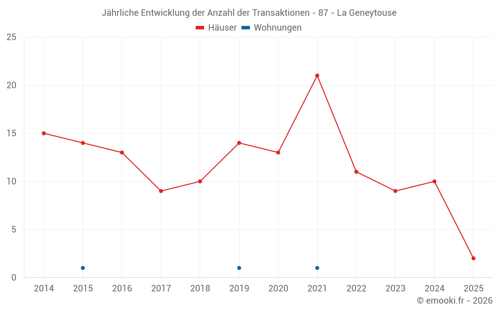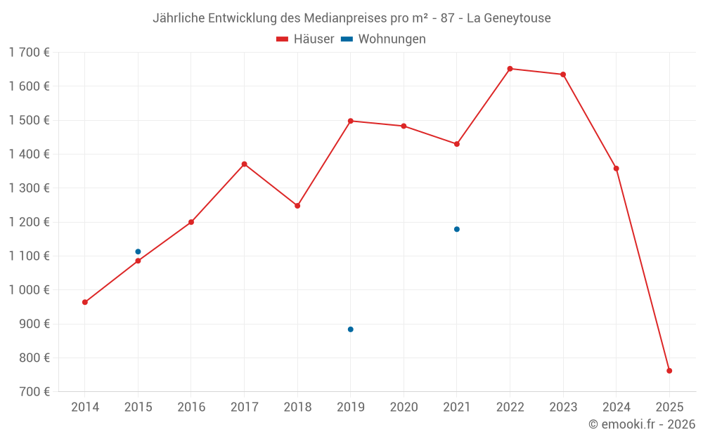 Der Durchschnittspreis auf den 19 Hausgeschäften der letzten 24 Monate in der Gemeinde La Geneytouse betrug 1 129 € pro Quadratmeter für einen mittleren Immobilienwert von 122 000 €. Über diesen Zeitraum hinweg lagen 60% der Transaktionen zwischen 767 und 1 793 € pro Quadratmeter (vom 2. bis zum 8. Dezil).
