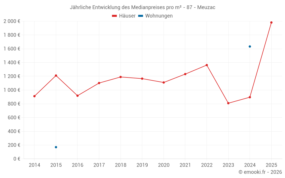 Der Durchschnittspreis auf den 24 Hausgeschäften der letzten 24 Monate in der Gemeinde Meuzac betrug 864 € pro Quadratmeter für einen mittleren Immobilienwert von 75 261 €. Über diesen Zeitraum hinweg lagen 60% der Transaktionen zwischen 627 und 1 299 € pro Quadratmeter (vom 2. bis zum 8. Dezil).
