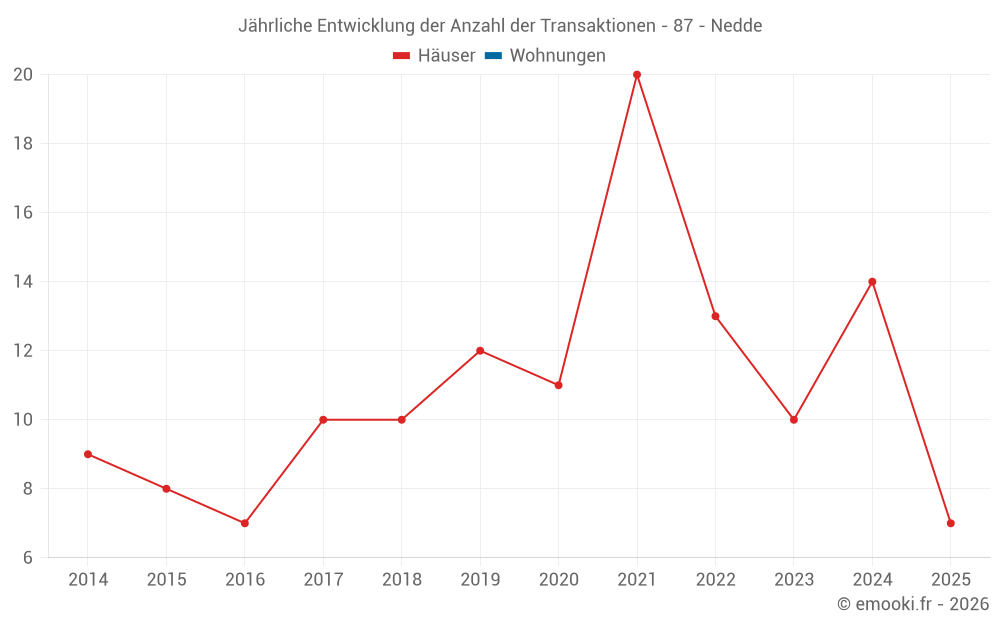 Der Durchschnittspreis auf den 21 Hausgeschäften der letzten 24 Monate in der Gemeinde Nedde betrug 952 € pro Quadratmeter für einen mittleren Immobilienwert von 73 600 €. Über diesen Zeitraum hinweg lagen 60% der Transaktionen zwischen 664 und 1 500 € pro Quadratmeter (vom 2. bis zum 8. Dezil).