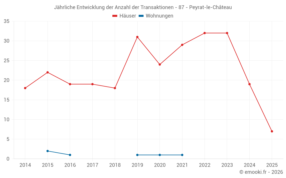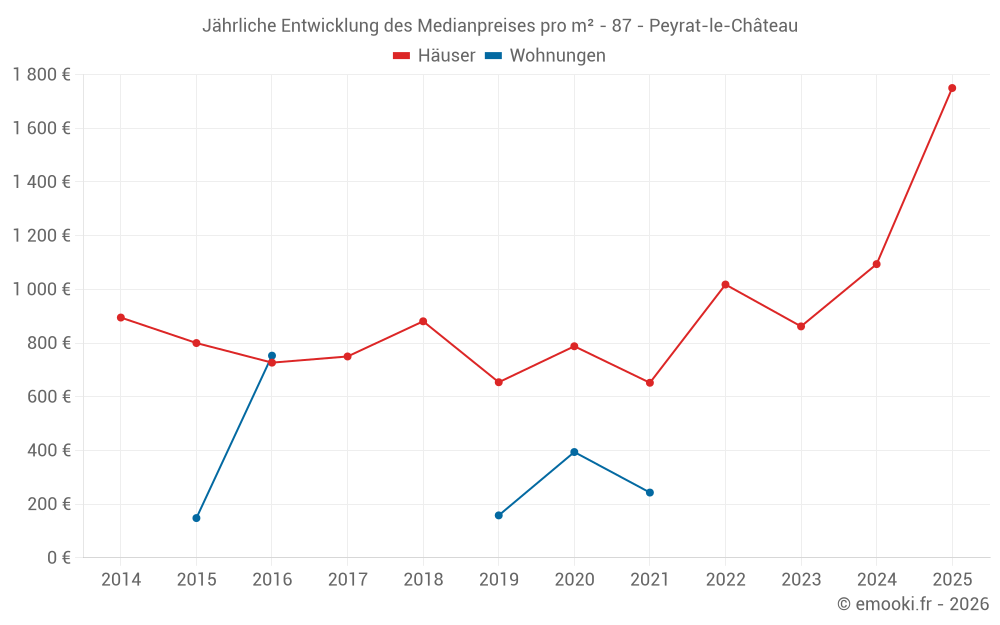 Der Durchschnittspreis auf den 19 Hausgeschäften der letzten 12 Monate in der Gemeinde Peyrat-le-Château betrug 1 500 € pro Quadratmeter für einen mittleren Immobilienwert von 113 000 €. Über diesen Zeitraum hinweg lagen 60% der Transaktionen zwischen 875 und 2 046 € pro Quadratmeter (vom 2. bis zum 8. Dezil).