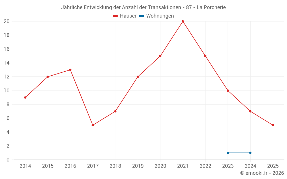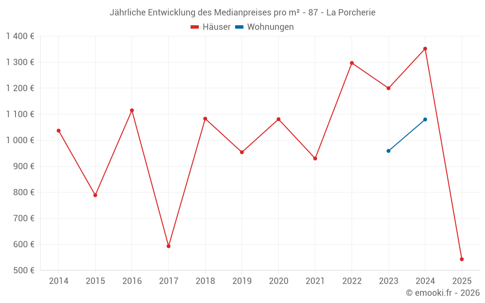 Der Durchschnittspreis auf den 16 Hausgeschäften der letzten 24 Monate in der Gemeinde La Porcherie betrug 1 179 € pro Quadratmeter für einen mittleren Immobilienwert von 102 250 €. Über diesen Zeitraum hinweg lagen 60% der Transaktionen zwischen 615 und 1 929 € pro Quadratmeter (vom 2. bis zum 8. Dezil).