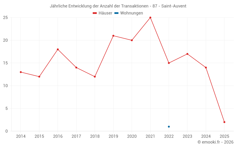 Der Durchschnittspreis auf den 23 Hausgeschäften der letzten 24 Monate in der Gemeinde Saint-Auvent betrug 1 057 € pro Quadratmeter für einen mittleren Immobilienwert von 120 000 €. Über diesen Zeitraum hinweg lagen 60% der Transaktionen zwischen 592 und 1 741 € pro Quadratmeter (vom 2. bis zum 8. Dezil).