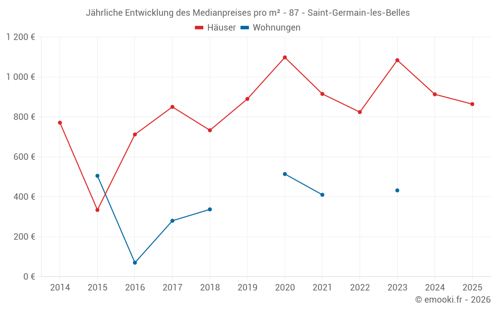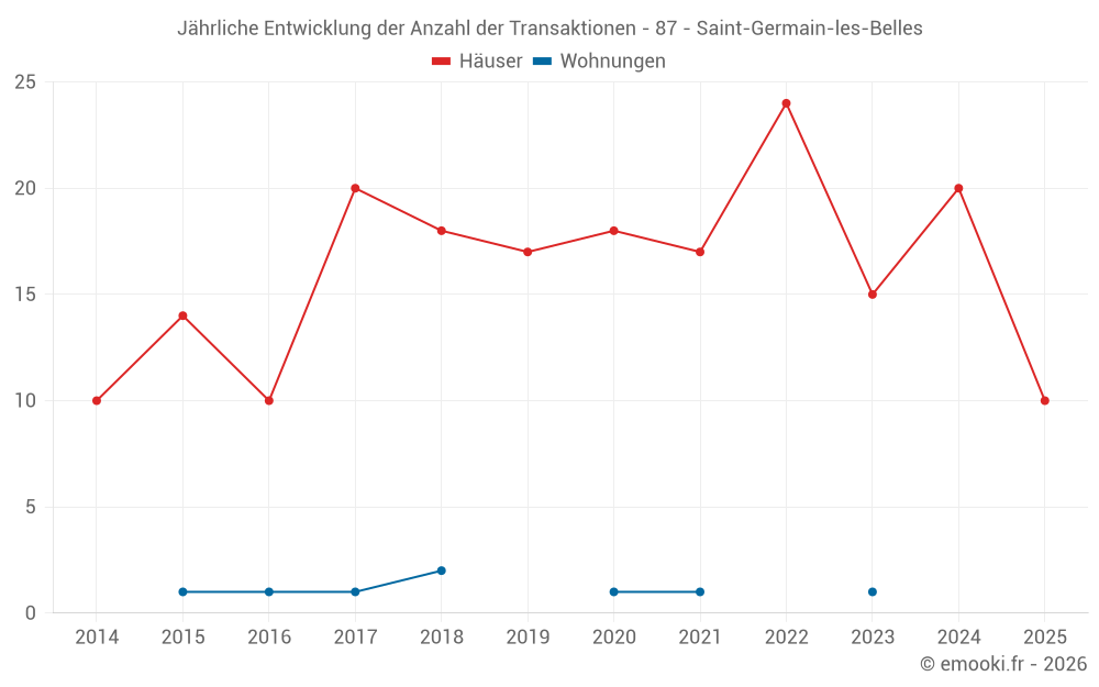 Der Durchschnittspreis auf den 24 Hausgeschäften der letzten 12 Monate in der Gemeinde Saint-Germain-les-Belles betrug 804 € pro Quadratmeter für einen mittleren Immobilienwert von 92 500 €. Über diesen Zeitraum hinweg lagen 60% der Transaktionen zwischen 348 und 1 502 € pro Quadratmeter (vom 2. bis zum 8. Dezil).