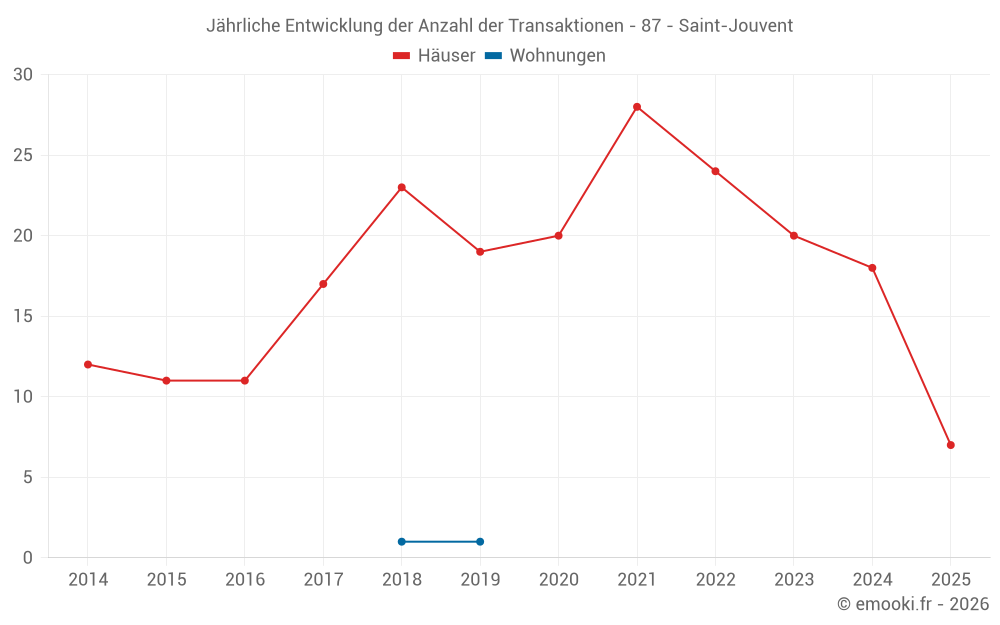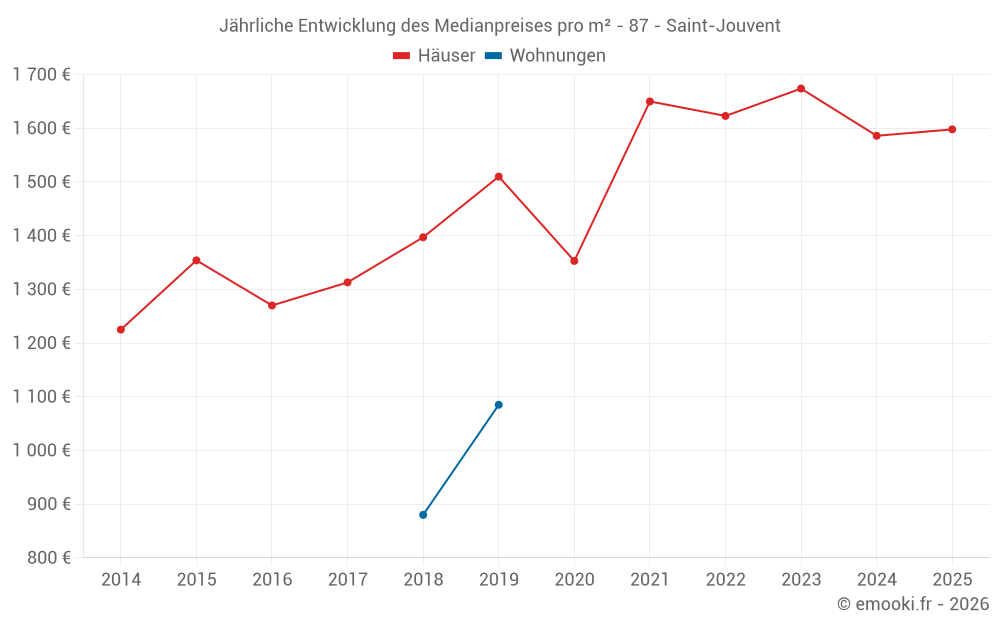 Der Durchschnittspreis auf den 17 Hausgeschäften der letzten 12 Monate in der Gemeinde Saint-Jouvent betrug 1 598 € pro Quadratmeter für einen mittleren Immobilienwert von 155 000 €. Über diesen Zeitraum hinweg lagen 60% der Transaktionen zwischen 1 103 und 1 986 € pro Quadratmeter (vom 2. bis zum 8. Dezil).