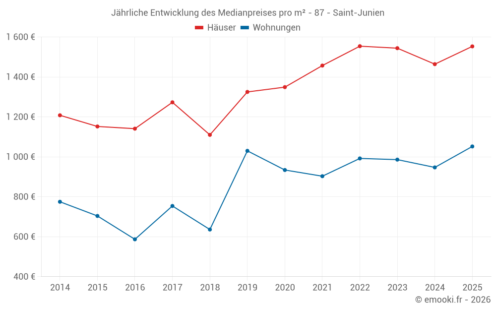 Der Durchschnittspreis auf den 21 Wohnungstransaktionen der letzten 24 Monate in der Gemeinde Saint-Junien betrug 1 019 € pro Quadratmeter für einen mittleren Immobilienwert von 80 000 €. Über diesen Zeitraum hinweg lagen 60% der Transaktionen zwischen 661 und 1 352 € pro Quadratmeter (vom 2. bis zum 8. Dezil).