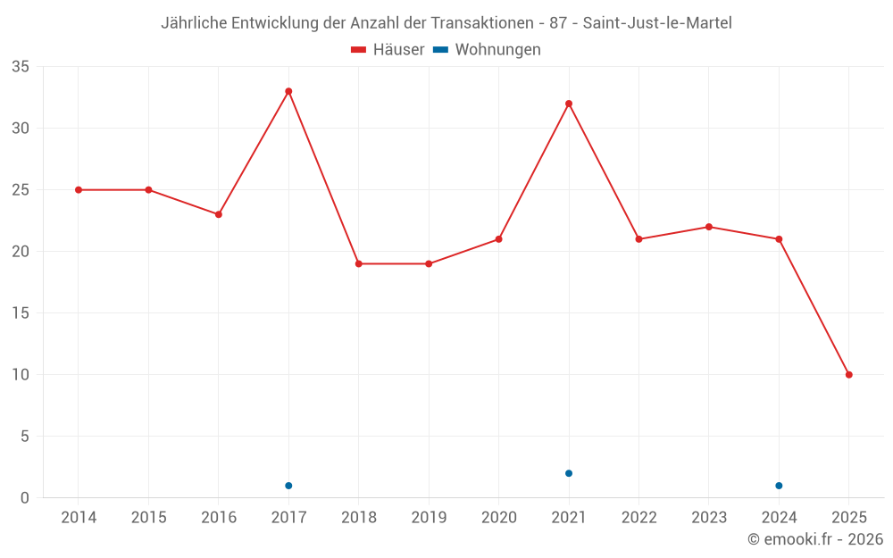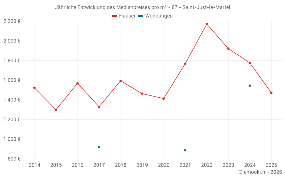 Der Durchschnittspreis auf den 22 Hausgeschäften der letzten 12 Monate in der Gemeinde Saint-Just-le-Martel betrug 1 566 € pro Quadratmeter für einen mittleren Immobilienwert von 209 000 €. Über diesen Zeitraum hinweg lagen 60% der Transaktionen zwischen 1 362 und 2 045 € pro Quadratmeter (vom 2. bis zum 8. Dezil).