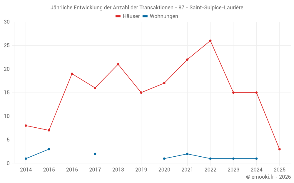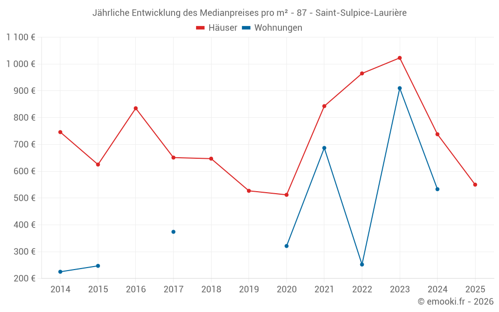 Der Durchschnittspreis auf den 24 Hausgeschäften der letzten 24 Monate in der Gemeinde Saint-Sulpice-Laurière betrug 824 € pro Quadratmeter für einen mittleren Immobilienwert von 52 000 €. Über diesen Zeitraum hinweg lagen 60% der Transaktionen zwischen 397 und 1 315 € pro Quadratmeter (vom 2. bis zum 8. Dezil).