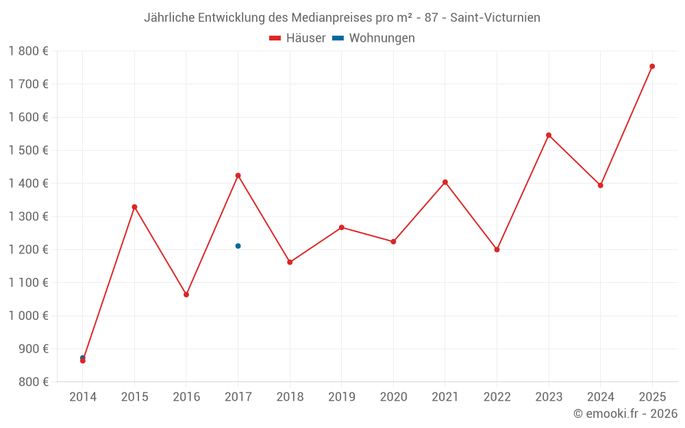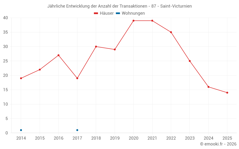 Der Durchschnittspreis auf den 25 Hausgeschäften der letzten 12 Monate in der Gemeinde Saint-Victurnien betrug 1 460 € pro Quadratmeter für einen mittleren Immobilienwert von 134 850 €. Über diesen Zeitraum hinweg lagen 60% der Transaktionen zwischen 1 015 und 1 978 € pro Quadratmeter (vom 2. bis zum 8. Dezil).
