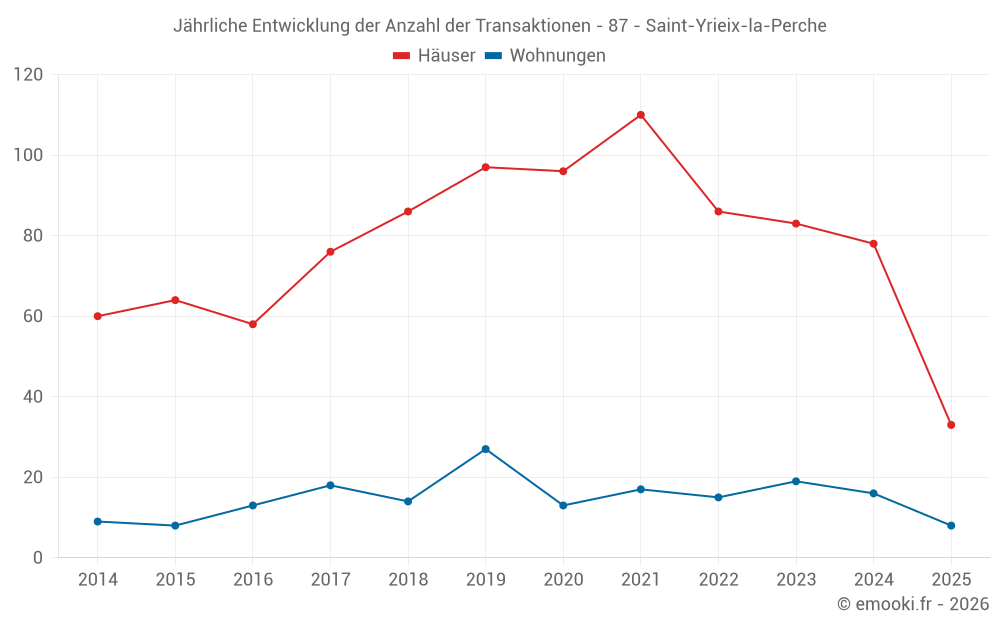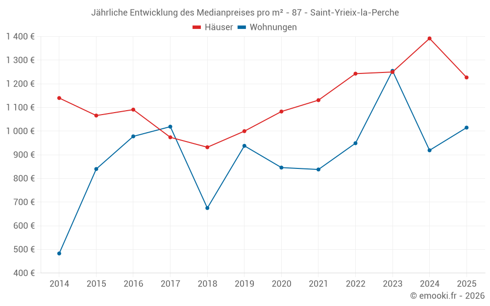 Der Durchschnittspreis auf den 32 Wohnungstransaktionen der letzten 24 Monate in der Gemeinde Saint-Yrieix-la-Perche betrug 976 € pro Quadratmeter für einen mittleren Immobilienwert von 82 625 €. Über diesen Zeitraum hinweg lagen 60% der Transaktionen zwischen 598 und 1 435 € pro Quadratmeter (vom 2. bis zum 8. Dezil).