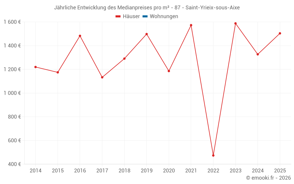 Der Durchschnittspreis auf den 19 Hausgeschäften der letzten 24 Monate in der Gemeinde Saint-Yrieix-sous-Aixe betrug 1 408 € pro Quadratmeter für einen mittleren Immobilienwert von 152 000 €. Über diesen Zeitraum hinweg lagen 60% der Transaktionen zwischen 864 und 1 962 € pro Quadratmeter (vom 2. bis zum 8. Dezil).