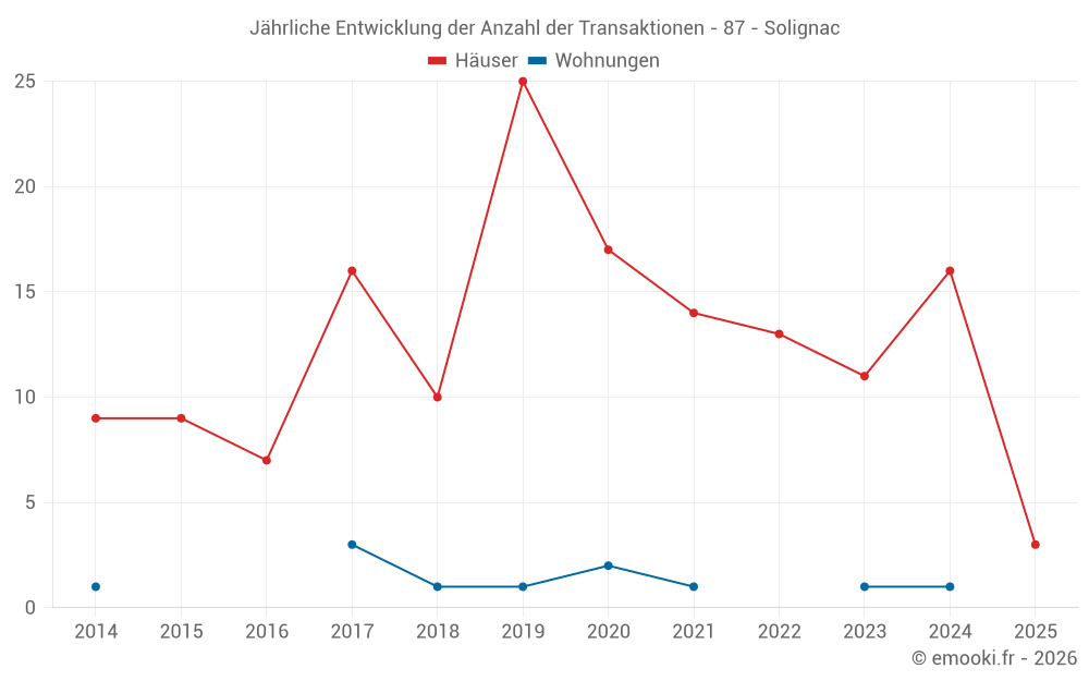 Der Durchschnittspreis auf den 24 Hausgeschäften der letzten 24 Monate in der Gemeinde Solignac betrug 1 646 € pro Quadratmeter für einen mittleren Immobilienwert von 169 750 €. Über diesen Zeitraum hinweg lagen 60% der Transaktionen zwischen 1 185 und 1 941 € pro Quadratmeter (vom 2. bis zum 8. Dezil).