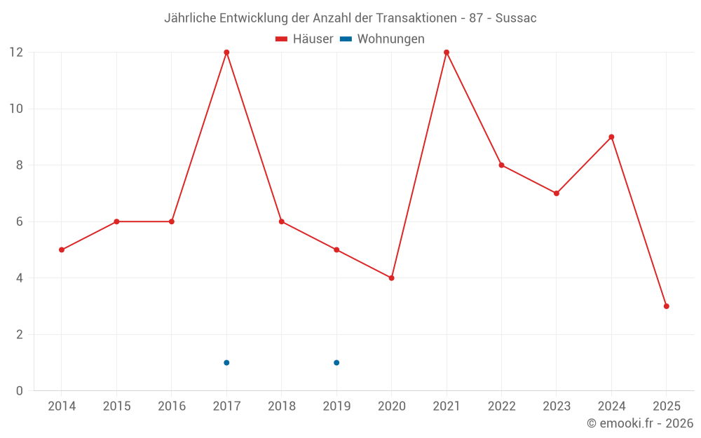 Der Durchschnittspreis auf den 15 Hausgeschäften der letzten 24 Monate in der Gemeinde Sussac betrug 1 256 € pro Quadratmeter für einen mittleren Immobilienwert von 86 000 €. Über diesen Zeitraum hinweg lagen 60% der Transaktionen zwischen 675 und 1 646 € pro Quadratmeter (vom 2. bis zum 8. Dezil).