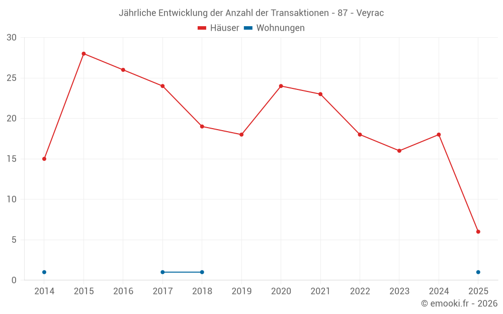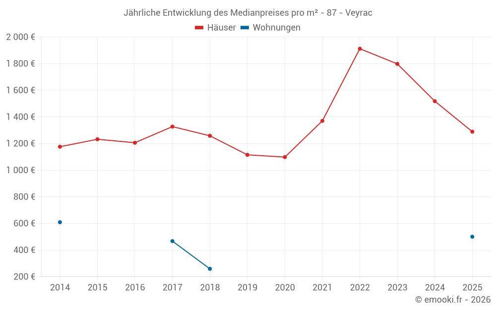 Der Durchschnittspreis auf den 32 Hausgeschäften der letzten 24 Monate in der Gemeinde Veyrac betrug 1 398 € pro Quadratmeter für einen mittleren Immobilienwert von 143 775 €. Über diesen Zeitraum hinweg lagen 60% der Transaktionen zwischen 962 und 1 922 € pro Quadratmeter (vom 2. bis zum 8. Dezil).