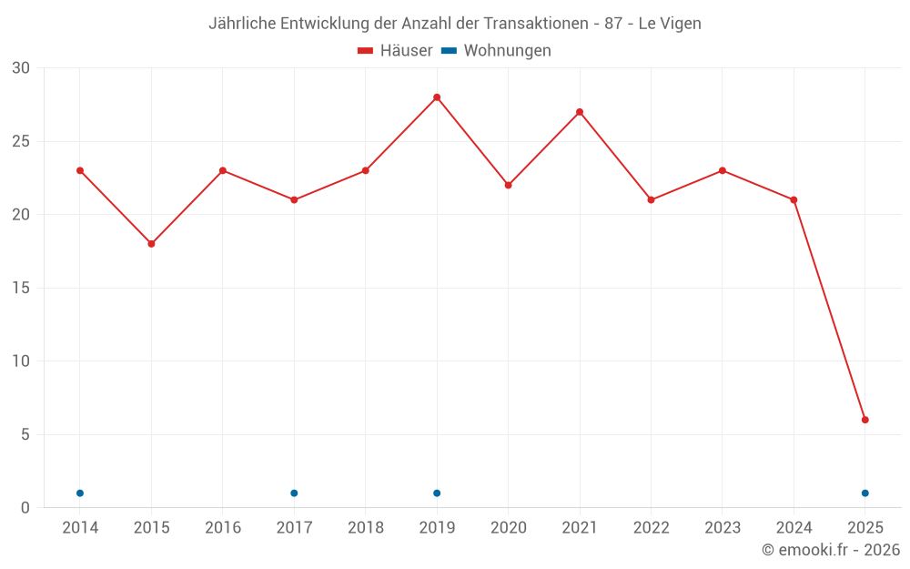 Der Durchschnittspreis auf den 21 Hausgeschäften der letzten 12 Monate in der Gemeinde Le Vigen betrug 2 005 € pro Quadratmeter für einen mittleren Immobilienwert von 228 000 €. Über diesen Zeitraum hinweg lagen 60% der Transaktionen zwischen 1 250 und 2 333 € pro Quadratmeter (vom 2. bis zum 8. Dezil).