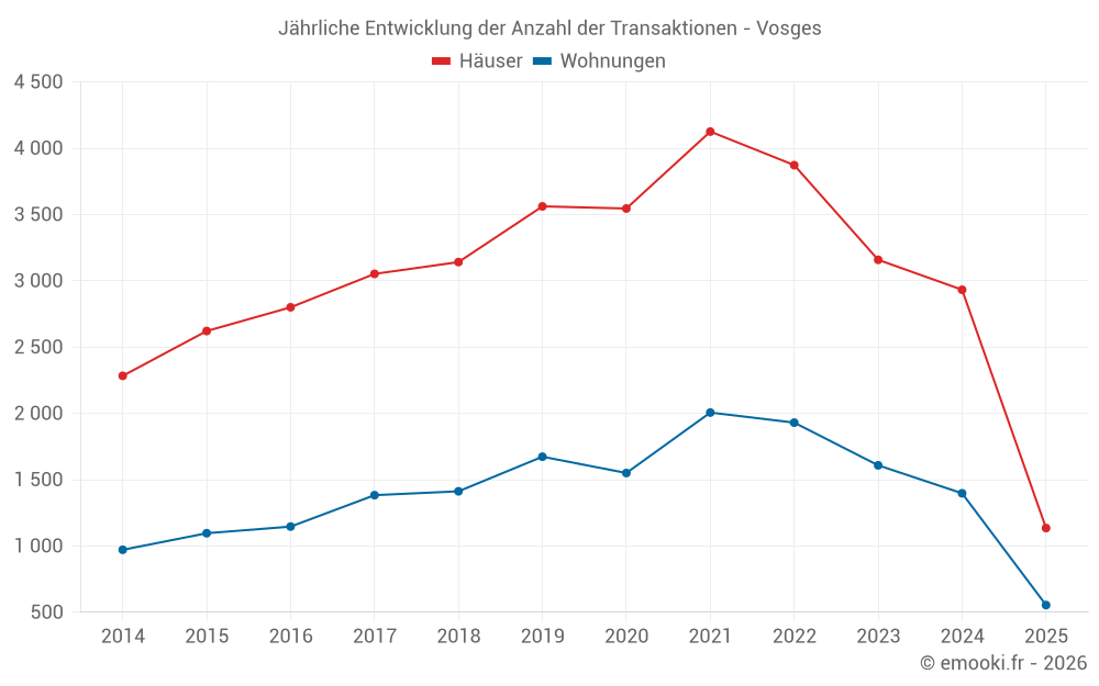 Der Durchschnittspreis auf den 360 Hausgeschäften der letzten 3 Monate im Vosges-Departement betrug 1 429 € pro Quadratmeter für einen mittleren Immobilienwert von 144 740 €. Über diesen Zeitraum hinweg lagen 60% der Transaktionen zwischen 708 und 2 317 € pro Quadratmeter (vom 2. bis zum 8. Dezil).