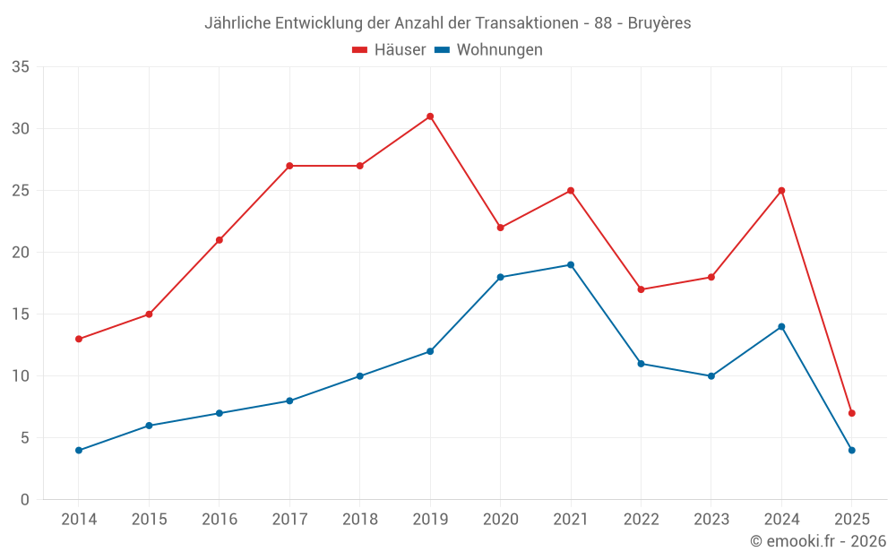 Der Durchschnittspreis auf den 23 Hausgeschäften der letzten 12 Monate in der Gemeinde Bruyères betrug 1 263 € pro Quadratmeter für einen mittleren Immobilienwert von 110 000 €. Über diesen Zeitraum hinweg lagen 60% der Transaktionen zwischen 875 und 1 359 € pro Quadratmeter (vom 2. bis zum 8. Dezil).