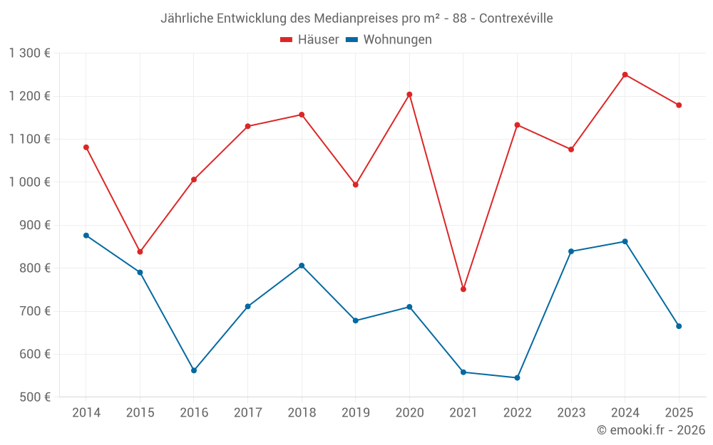 Der Durchschnittspreis auf den 26 Wohnungstransaktionen der letzten 24 Monate in der Gemeinde Contrexéville betrug 690 € pro Quadratmeter für einen mittleren Immobilienwert von 52 750 €. Über diesen Zeitraum hinweg lagen 60% der Transaktionen zwischen 440 und 988 € pro Quadratmeter (vom 2. bis zum 8. Dezil).