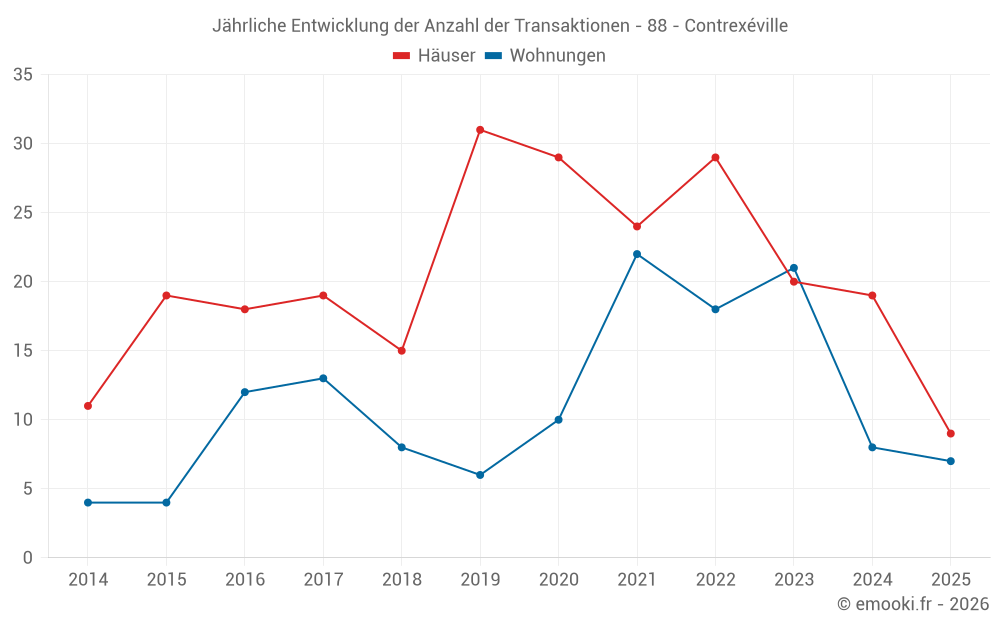 Der Durchschnittspreis auf den 22 Hausgeschäften der letzten 12 Monate in der Gemeinde Contrexéville betrug 1 175 € pro Quadratmeter für einen mittleren Immobilienwert von 104 750 €. Über diesen Zeitraum hinweg lagen 60% der Transaktionen zwischen 820 und 1 438 € pro Quadratmeter (vom 2. bis zum 8. Dezil).