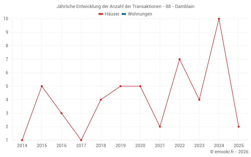 Der Durchschnittspreis auf den 14 Hausgeschäften der letzten 24 Monate in der Gemeinde Damblain betrug 444 € pro Quadratmeter für einen mittleren Immobilienwert von 39 750 €. Über diesen Zeitraum hinweg lagen 60% der Transaktionen zwischen 319 und 1 063 € pro Quadratmeter (vom 2. bis zum 8. Dezil).