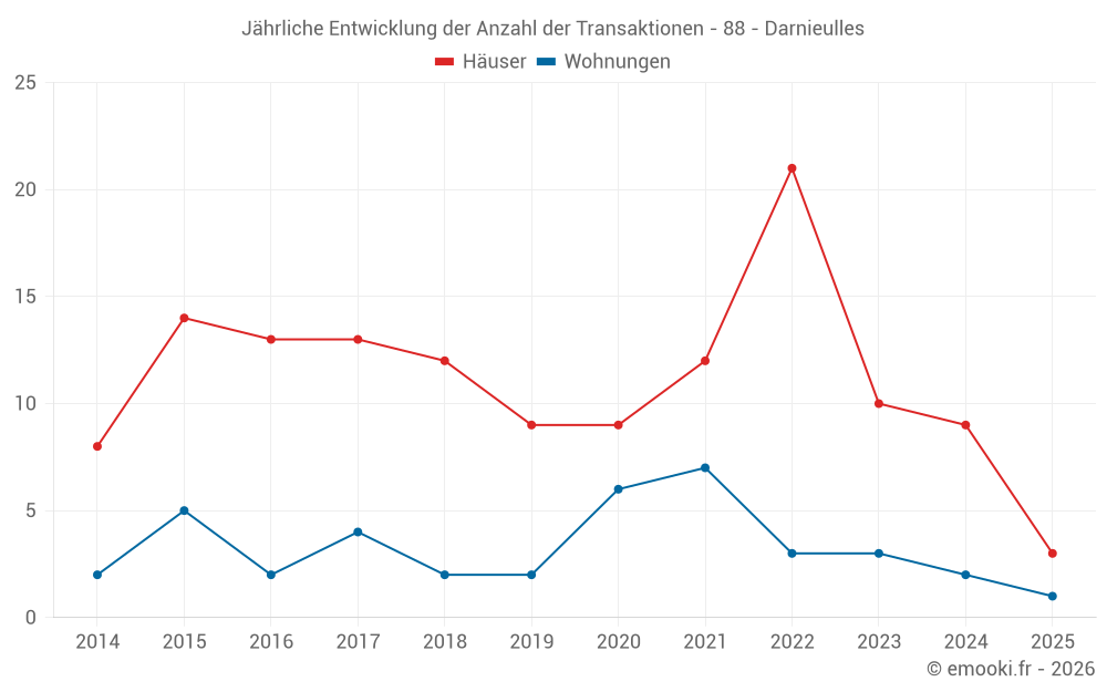 Der Durchschnittspreis auf den 19 Hausgeschäften der letzten 24 Monate in der Gemeinde Darnieulles betrug 1 547 € pro Quadratmeter für einen mittleren Immobilienwert von 175 000 €. Über diesen Zeitraum hinweg lagen 60% der Transaktionen zwischen 1 039 und 1 915 € pro Quadratmeter (vom 2. bis zum 8. Dezil).