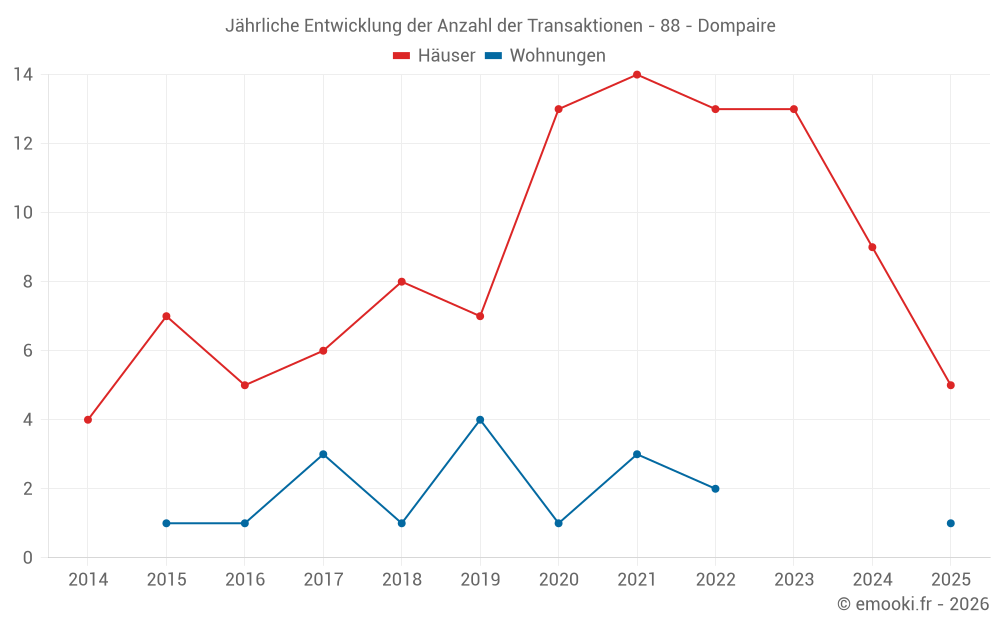 Der Durchschnittspreis auf den 22 Hausgeschäften der letzten 24 Monate in der Gemeinde Dompaire betrug 1 378 € pro Quadratmeter für einen mittleren Immobilienwert von 145 200 €. Über diesen Zeitraum hinweg lagen 60% der Transaktionen zwischen 986 und 1 880 € pro Quadratmeter (vom 2. bis zum 8. Dezil).