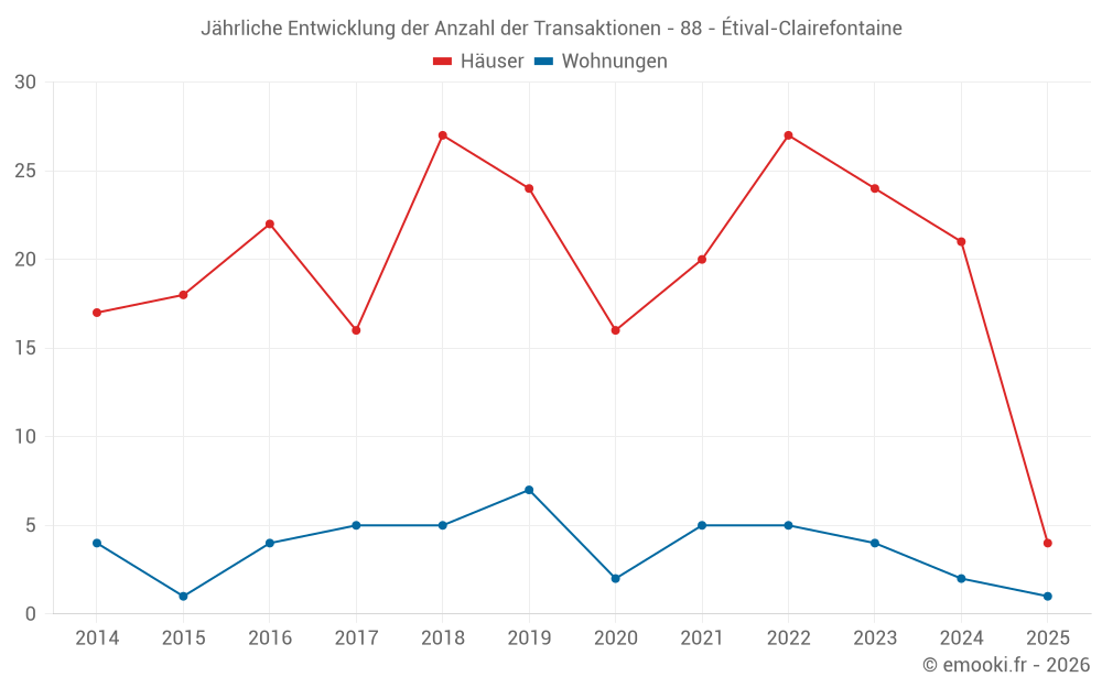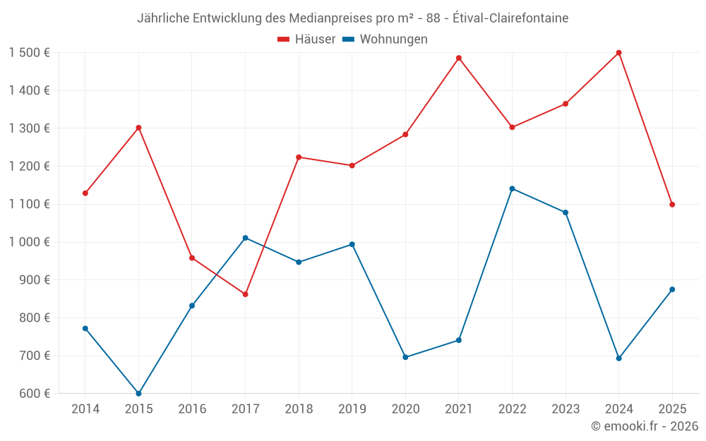 Der Durchschnittspreis auf den 18 Hausgeschäften der letzten 12 Monate in der Gemeinde Étival-Clairefontaine betrug 1 412 € pro Quadratmeter für einen mittleren Immobilienwert von 150 000 €. Über diesen Zeitraum hinweg lagen 60% der Transaktionen zwischen 900 und 2 415 € pro Quadratmeter (vom 2. bis zum 8. Dezil).
