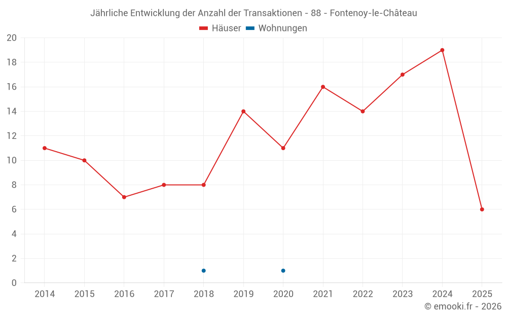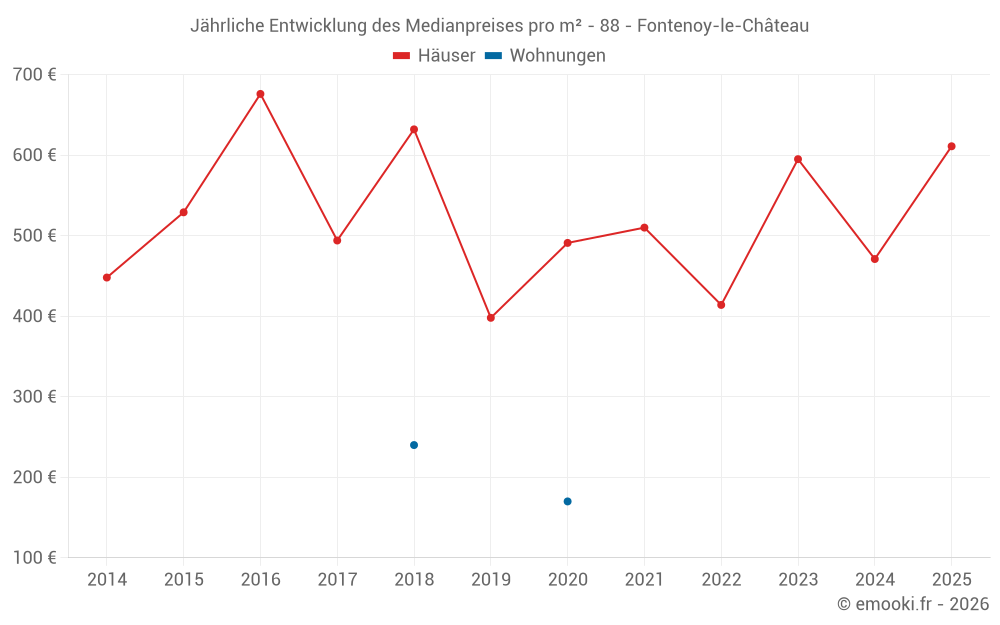 Der Durchschnittspreis auf den 21 Hausgeschäften der letzten 12 Monate in der Gemeinde Fontenoy-le-Château betrug 471 € pro Quadratmeter für einen mittleren Immobilienwert von 40 685 €. Über diesen Zeitraum hinweg lagen 60% der Transaktionen zwischen 152 und 1 241 € pro Quadratmeter (vom 2. bis zum 8. Dezil).
