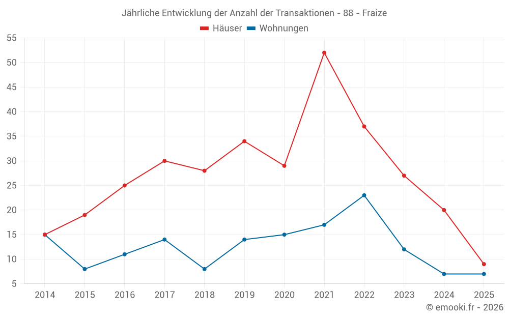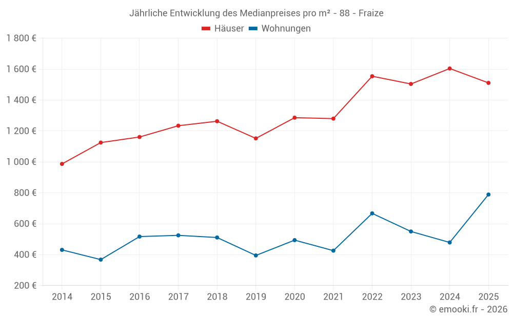 Der Durchschnittspreis auf den 20 Hausgeschäften der letzten 12 Monate in der Gemeinde Fraize betrug 1 524 € pro Quadratmeter für einen mittleren Immobilienwert von 144 750 €. Über diesen Zeitraum hinweg lagen 60% der Transaktionen zwischen 1 082 und 1 798 € pro Quadratmeter (vom 2. bis zum 8. Dezil).