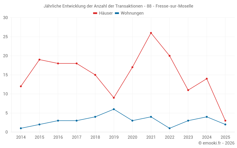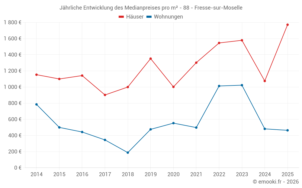 Der Durchschnittspreis auf den 23 Hausgeschäften der letzten 24 Monate in der Gemeinde Fresse-sur-Moselle betrug 1 579 € pro Quadratmeter für einen mittleren Immobilienwert von 120 000 €. Über diesen Zeitraum hinweg lagen 60% der Transaktionen zwischen 818 und 1 770 € pro Quadratmeter (vom 2. bis zum 8. Dezil).