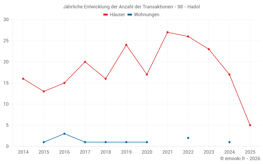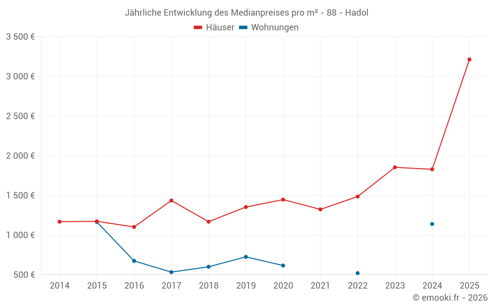 Der Durchschnittspreis auf den 30 Hausgeschäften der letzten 24 Monate in der Gemeinde Hadol betrug 1 865 € pro Quadratmeter für einen mittleren Immobilienwert von 184 600 €. Über diesen Zeitraum hinweg lagen 60% der Transaktionen zwischen 1 229 und 2 344 € pro Quadratmeter (vom 2. bis zum 8. Dezil).