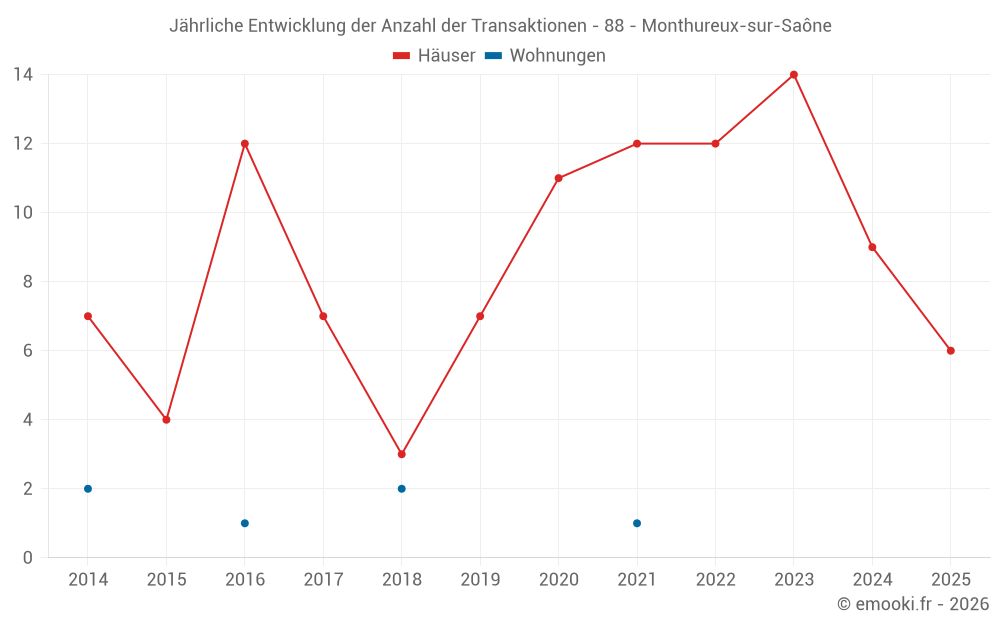 Der Durchschnittspreis auf den 22 Hausgeschäften der letzten 24 Monate in der Gemeinde Monthureux-sur-Saône betrug 504 € pro Quadratmeter für einen mittleren Immobilienwert von 51 000 €. Über diesen Zeitraum hinweg lagen 60% der Transaktionen zwischen 257 und 841 € pro Quadratmeter (vom 2. bis zum 8. Dezil).
