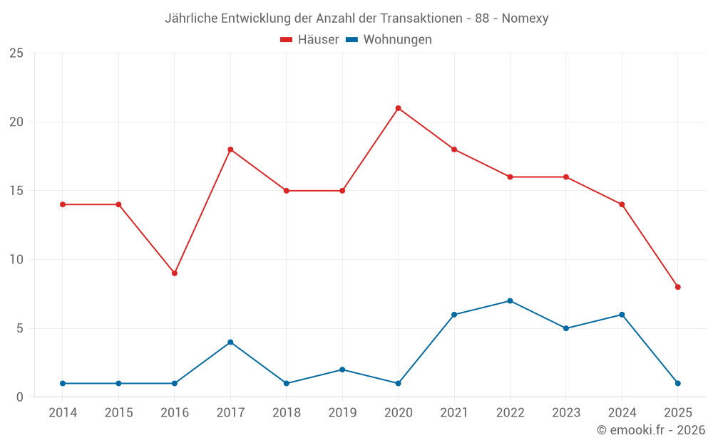 Der Durchschnittspreis auf den 16 Hausgeschäften der letzten 12 Monate in der Gemeinde Nomexy betrug 1 438 € pro Quadratmeter für einen mittleren Immobilienwert von 161 250 €. Über diesen Zeitraum hinweg lagen 60% der Transaktionen zwischen 963 und 1 818 € pro Quadratmeter (vom 2. bis zum 8. Dezil).