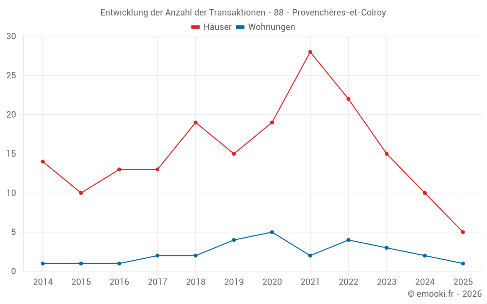 Der Durchschnittspreis auf den 23 Hausgeschäften der letzten 24 Monate in der Gemeinde Provenchères-et-Colroy betrug 1 163 € pro Quadratmeter für einen mittleren Immobilienwert von 116 000 €. Über diesen Zeitraum hinweg lagen 60% der Transaktionen zwischen 805 und 1 674 € pro Quadratmeter (vom 2. bis zum 8. Dezil).