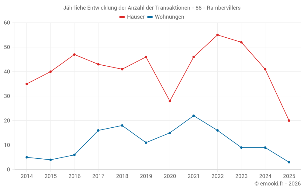 Der Durchschnittspreis auf den 20 Hausgeschäften der letzten 6 Monate in der Gemeinde Rambervillers betrug 892 € pro Quadratmeter für einen mittleren Immobilienwert von 83 697 €. Über diesen Zeitraum hinweg lagen 60% der Transaktionen zwischen 499 und 1 314 € pro Quadratmeter (vom 2. bis zum 8. Dezil).