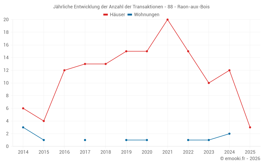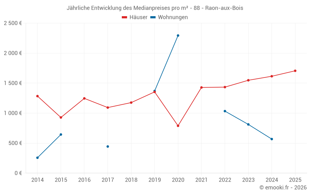 Der Durchschnittspreis auf den 19 Hausgeschäften der letzten 24 Monate in der Gemeinde Raon-aux-Bois betrug 1 580 € pro Quadratmeter für einen mittleren Immobilienwert von 209 000 €. Über diesen Zeitraum hinweg lagen 60% der Transaktionen zwischen 1 214 und 2 108 € pro Quadratmeter (vom 2. bis zum 8. Dezil).