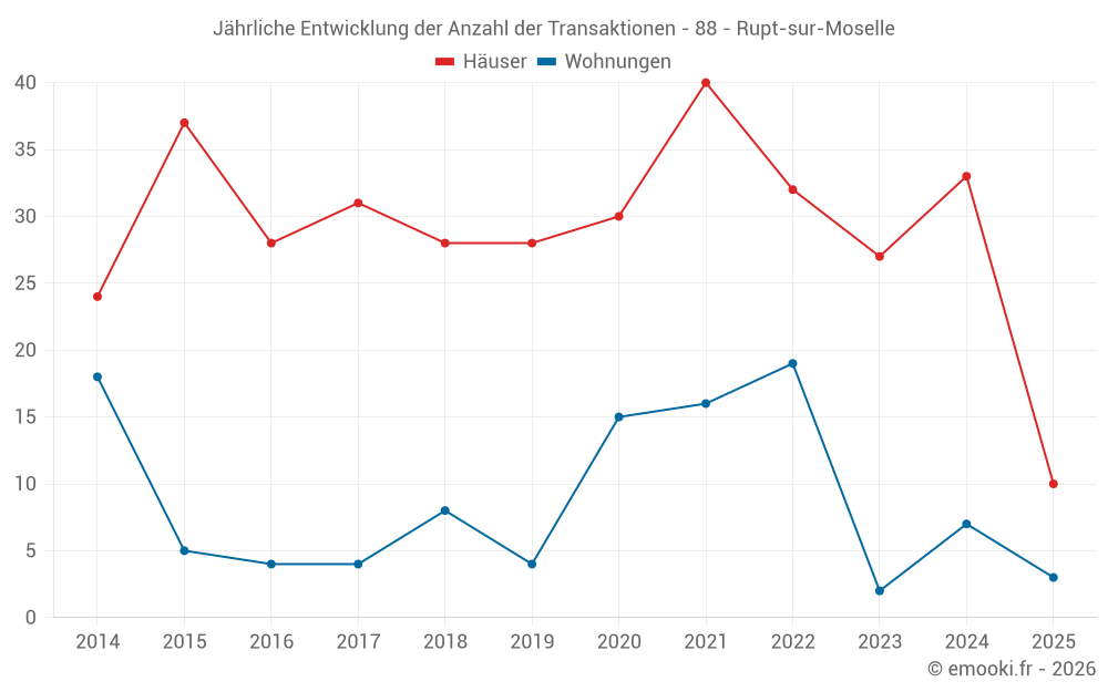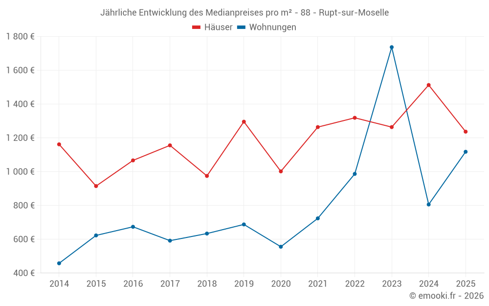 Der Durchschnittspreis auf den 29 Hausgeschäften der letzten 12 Monate in der Gemeinde Rupt-sur-Moselle betrug 1 496 € pro Quadratmeter für einen mittleren Immobilienwert von 128 000 €. Über diesen Zeitraum hinweg lagen 60% der Transaktionen zwischen 940 und 2 270 € pro Quadratmeter (vom 2. bis zum 8. Dezil).