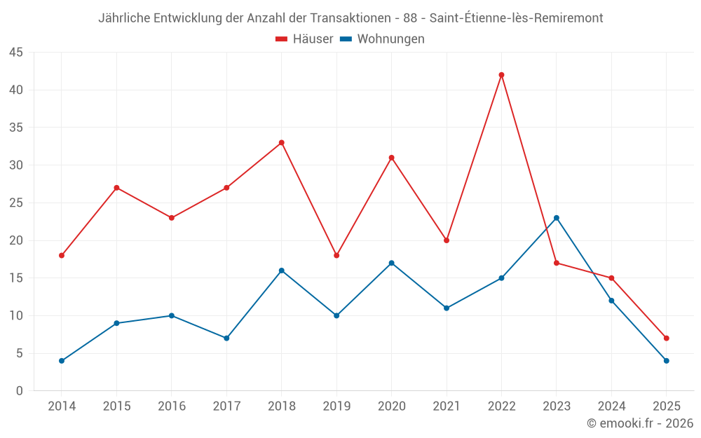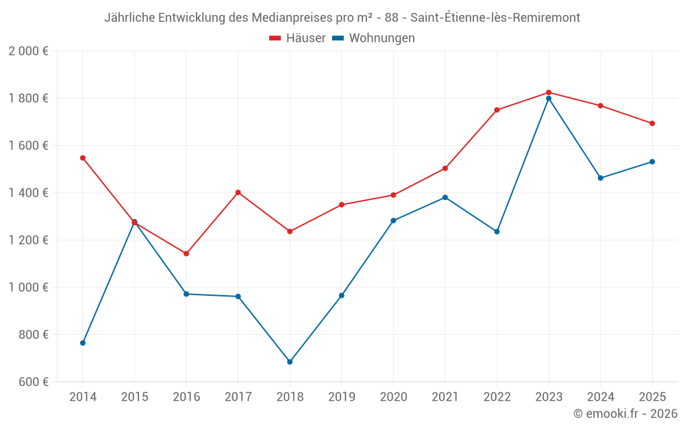 Der Durchschnittspreis auf den 23 Wohnungstransaktionen der letzten 24 Monate in der Gemeinde Saint-Étienne-lès-Remiremont betrug 1 481 € pro Quadratmeter für einen mittleren Immobilienwert von 144 000 €. Über diesen Zeitraum hinweg lagen 60% der Transaktionen zwischen 1 279 und 1 795 € pro Quadratmeter (vom 2. bis zum 8. Dezil).